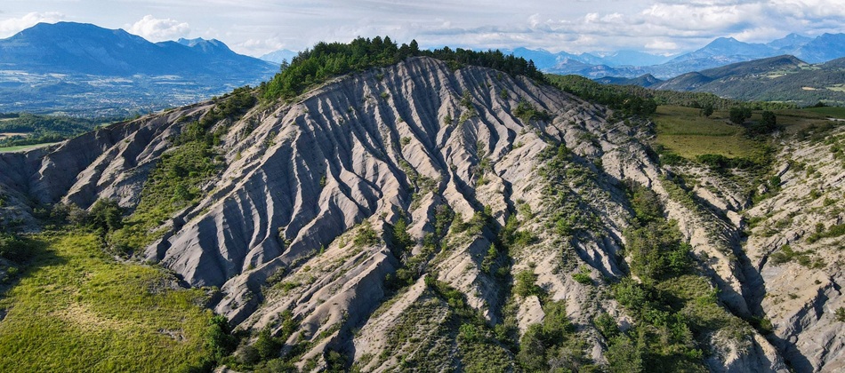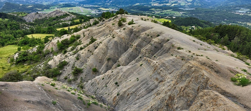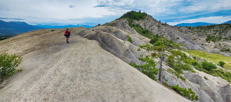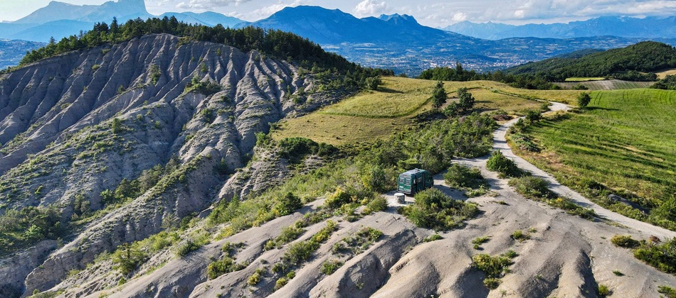 Bei Chateauvieux findet sich dann ein Nachtplatz an einem ganz ungewöhnlichen Ort: Am höchsten Punkt der morgigen Wanderung. Der Schotterweg bis dahin ist zwar anspruchsvoll, aber die Aussicht dafür atemberaubend. Erneut gewaltige Hänge mit Erosionsrinnen und kahlen Tonkämmen, an denen sich keine Vegetation halten kann….