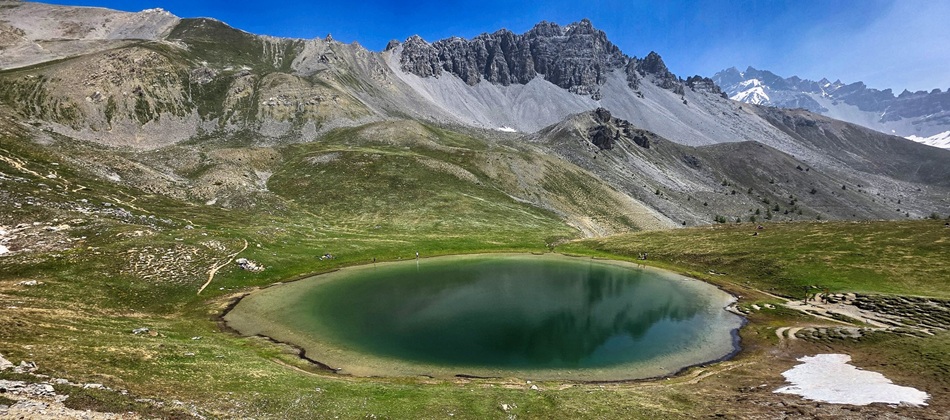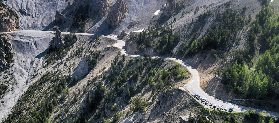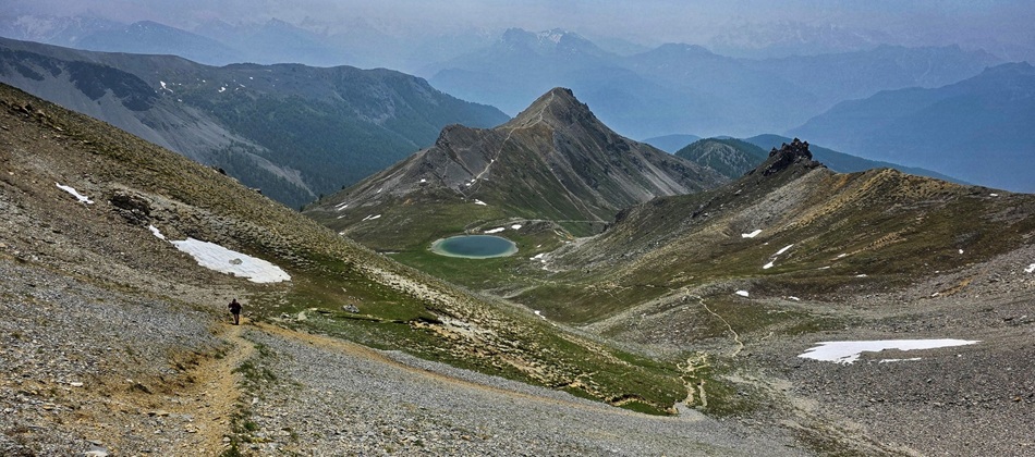 Der Parkplatz für die Wanderung liegt vor dem eigentlichen Pass (2350m) auf 2200m mit einer fantastischen Sicht auf die „Wüste des Izoard“, eine riesige Schuttreiße vom Gipfel des Pic de Quest herab.