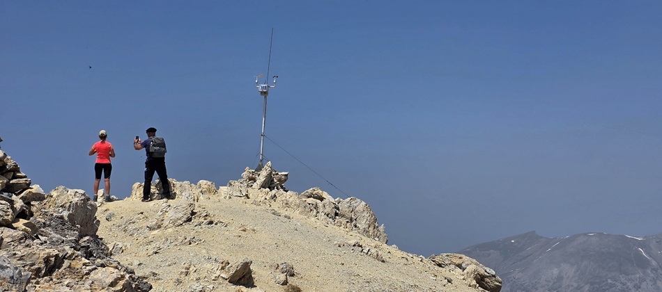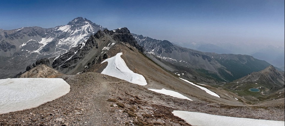 Nach Norden hin geht es dann weiter bergan. Die Wanderspur führt durch Murmeltiergelände, wird dann aber immer steiler. An einer Schuttreiße vorbei steigt der Pfad stetig und steil an. So erreicht man den Sattel vor dem Gipfel nach rund 45 Minuten Gehzeit. Heute war die Fernsicht nahezu nicht vorhanden. Selbst ein „Erahnen“ dessen, was man hätte an zahlreichen Bergen sehen können, war nicht möglich. Dennoch: der Blick in die nähere Umgebung und den 3320m hohen „Pic de Rochebrune“ mit seinen weißen Schneefeldern ist bereits sehr beeindruckend. Zum Gipfel sind es noch etwa 50 Höhenmeter, dann steht man….ja, nicht an einem Gipfelkreuz, sondern an einem kurzen Mast mit einer Wetterstation. Direkt unter einem liegt die Casse Deserte, der steile Abschwung mit dem gewaltigen Geröllfeld und den einzeln darin stehenden Felssäulen. Der Blick geht zum Col d’Izoard und Clot la Cime (2732m) und natürlich an klaren Tagen weit hinein bis zu den Gipfeln der Ecrins.