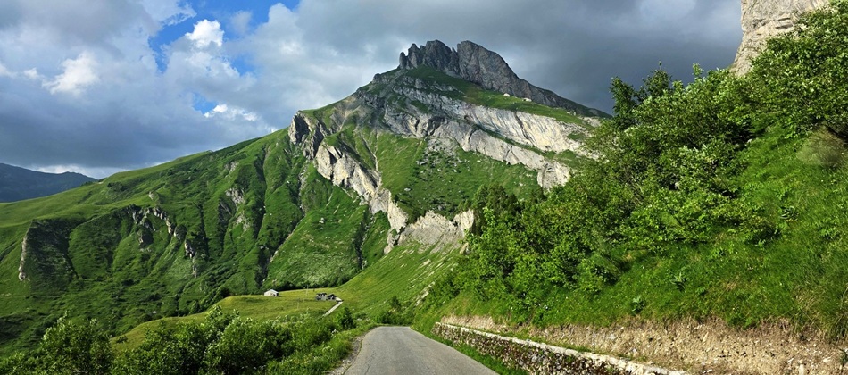 Der Roc du Vent ist ein mächtiger Klotz am Ende einer langen Kammlinie, die zur Straße hin eher mild und mit endlosen Wiesenflächen bedeckt aussieht. Der felsige Steilabfall liegt auf der anderen Seite.