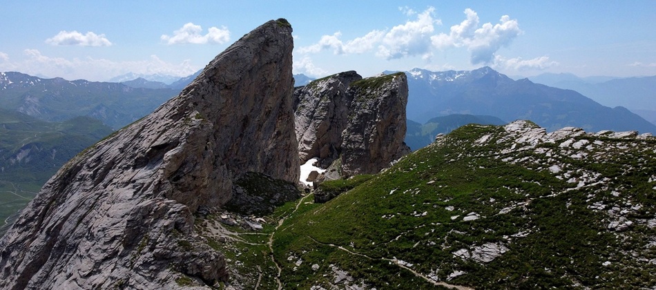 Wenn man kein Klettersteiggeher ist, erreicht man als Wanderer zwar nicht den höchsten Punkt. Aber zwischen den Felstürmen im Gipfelbereich gibt es genug Aussicht, dass sich der Aufstieg auf jeden Fall lohnt. Ein kühler Tunnel und eine endlos wirkende Wiesenlandschaft in steiler Lage sind Teil der einfachen, aber steilen Wanderung.