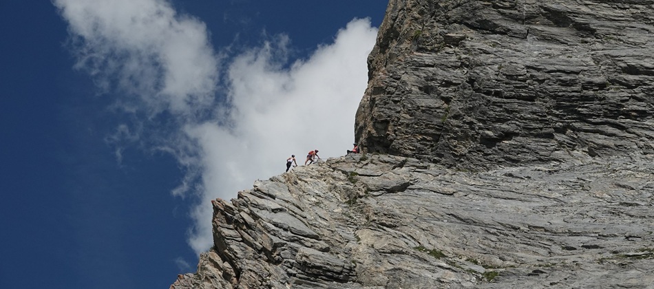 Die Mittagspause ein paar Meter vom „Trubel“ entfernt am Kamm bringt dann noch eine höchst erfreuliche Begegnung: ein Steinbock, der in der steilen Felswand knapp unter dem Kamm zeigt, wie geschickt er auch an exponierten, aussichtslos erscheinenden Stellen noch weiterkommt. Spannend und ein Moment der Bewunderung.