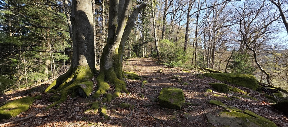 Ein steilerer Aufstieg am Burgkamm entlang zu Aussichtspunkten am Neckar, gefolgt von breiten Forstwegen zur Hoppe Hütte und dem Steinernen Tisch. Abstieg und oberhalb der Neckarschleife wieder zurück.