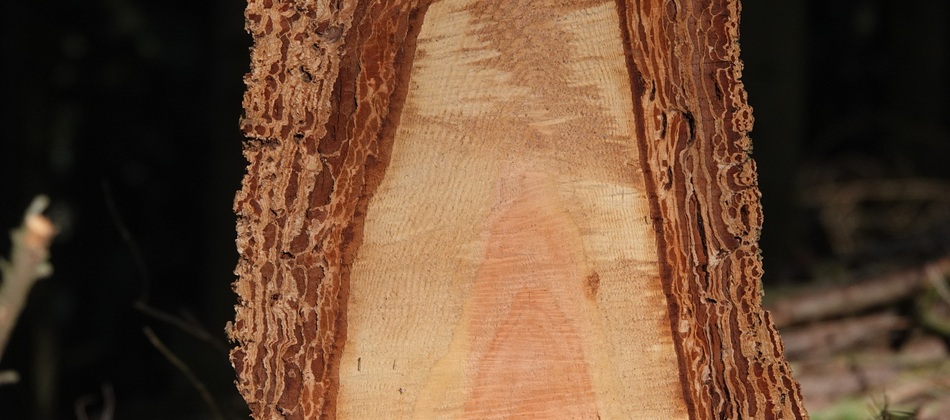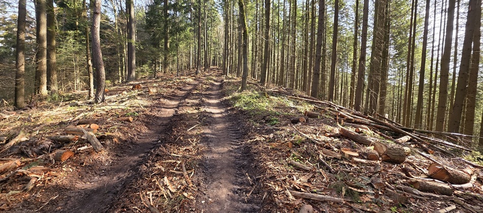 Die nächsten knapp 200 Höhenmeter folgt der Wanderpfad dem Bergkamm hinauf. Gelegentliche Ausblickstellen wechseln sich mit schönen Waldstücken ab, bis man auf die waagrecht verlaufende Forststrasse zur Hoppe Hütte trifft. Weit oberhalb des Neckars geht es nun in weitem Bogen durch den Hochwald zu der Hütte. Damit die überhaupt etwas Sicht hat, ist eine lange Schneise in den Wald geschnitten worden. Ein schattiger Platz für eine Rast im Hochsommer.