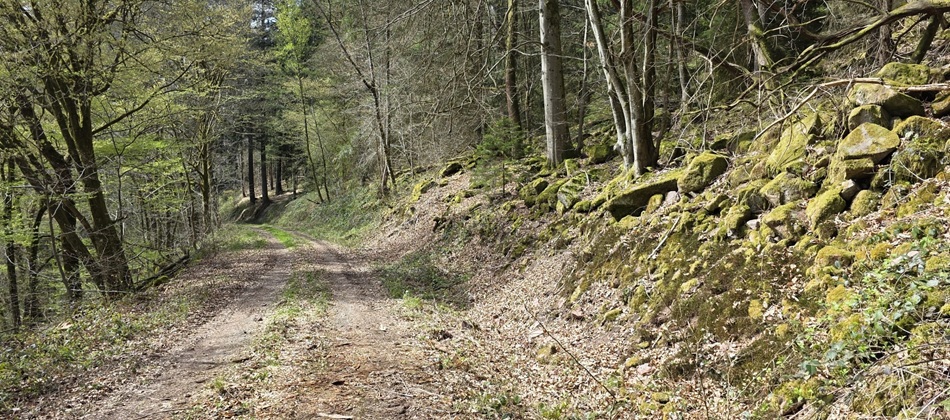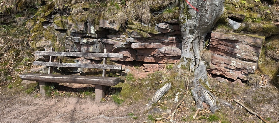 Auf rund 2,5 km geht es nun auf breiten Forstwegen im Zick-Zack bergab. Der Weg ist bequem, aber auch wenig abwechslungsreich. Erst, wenn man weit unten auf den Neckarsteig trifft und diesem nach rechts folgt, stellt sich wieder Wanderpfad-Feeling ein. Durch ein kleines Seitental erreicht man eine aussichtsreiche Stelle mit einer Bank vor einer kleinen Felswand: die Neckarschleife von Hirschhorn liegt vor einem und das Schloss als Ende des Rundweges ist nicht mehr weit.
