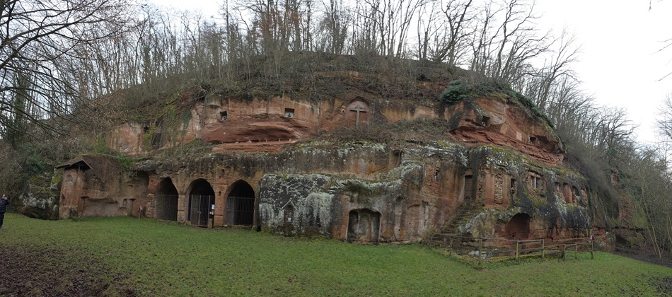 Nachdem man das Panorama an der herrlichen Sitzbank genossen hast, führt der Pfad wieder, stellenweise steil, bergab in Richtung des bereiten Talgrundes. Man passiert die weitläufigen Gebäude der Diakonie (u.a. Wohnhilfe für Obdachlose), bevor man das kulturhistorisches Juwel erreicht: die Felsenkirche.