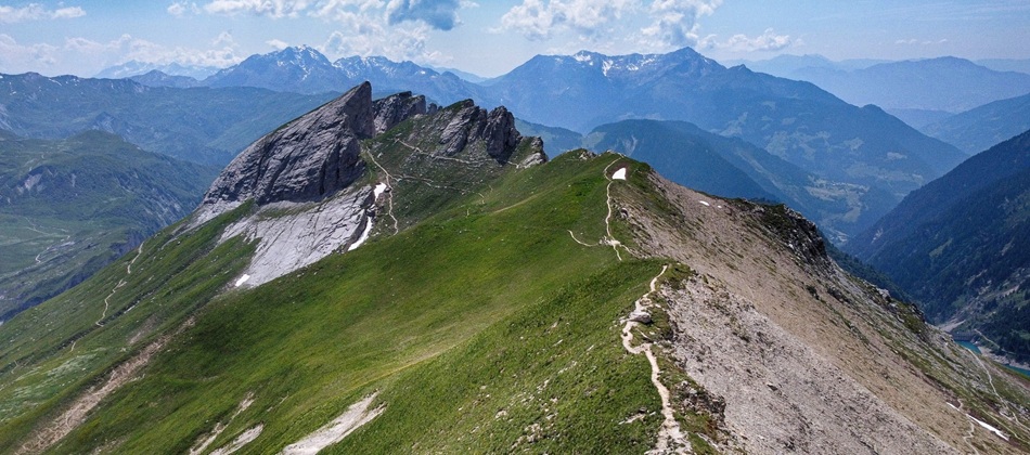 Wenn man kein Klettersteiggeher ist, erreicht man als Wanderer zwar nicht den höchsten Punkt. Aber zwischen den Felstürmen im Gipfelbereich gibt es genug Aussicht, dass sich der Aufstieg auf jeden Fall lohnt. Ein kühler Tunnel und eine endlos wirkende Wiesenlandschaft in steiler Lage sind Teil der einfachen, aber steilen Wanderung.