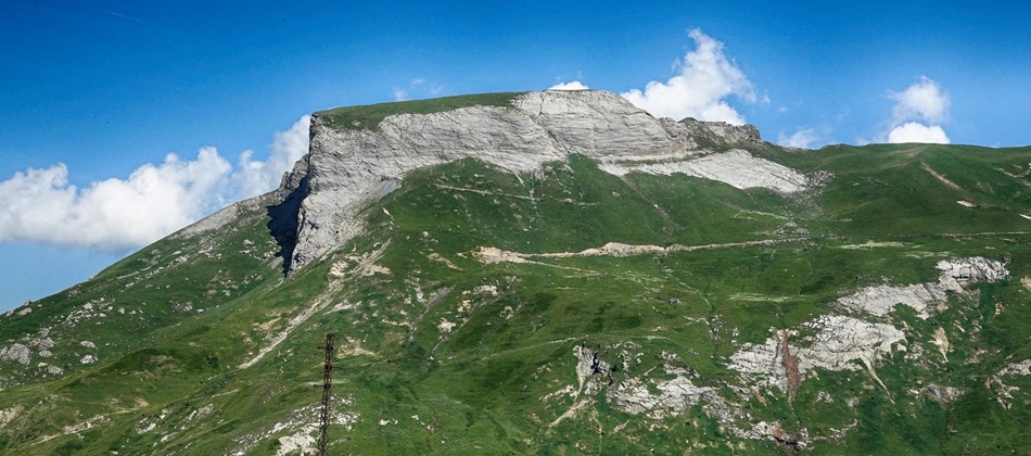 Der Roc du Vent ist ein mächtiger Klotz am Ende einer langen Kammlinie, die zur Straße hin eher mild und mit endlosen Wiesenflächen bedeckt aussieht. Der felsige Steilabfall liegt auf der anderen Seite.