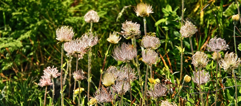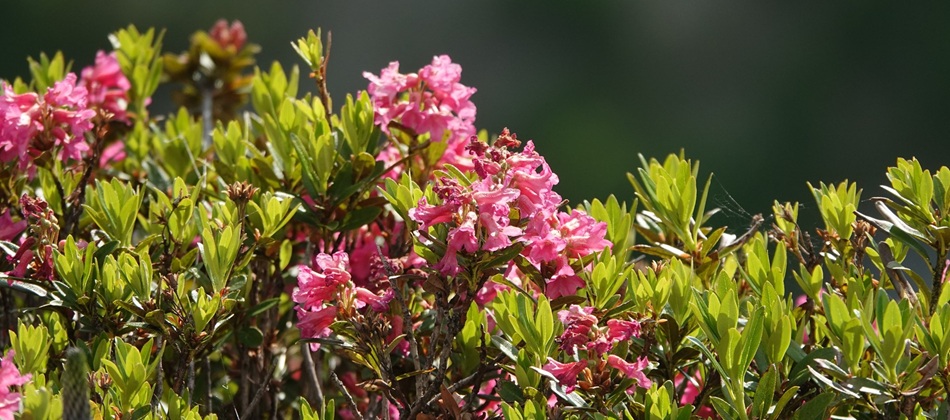 Der direkte Aufstieg für den Wanderer, der hinauf möchte, ist ein schmaler und weiter oben verdammt steiler Wiesenpfad. Herrlich die Blütenfülle und die sich weitende Sicht, aber eben steil. Oben angekommen konnte man während des Aufstiegs schon einigen Klettersteig-Gehern bei ihrem Weg hinauf durch die Felswand zuschauen.