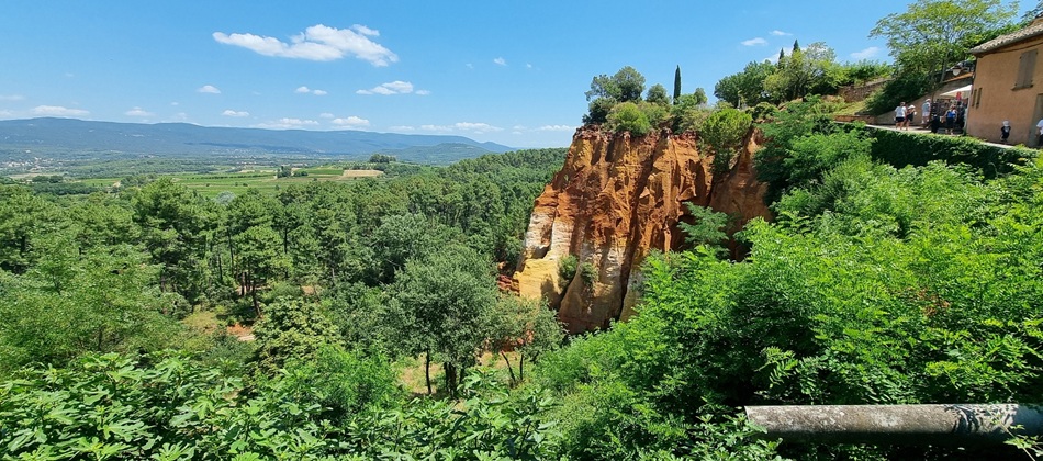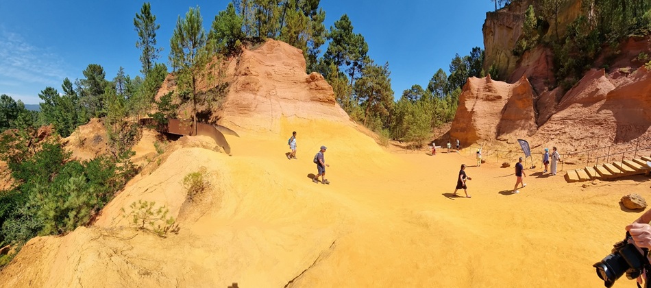 In Roussillion ist viel los, obwohl es Montag ist. Mit Glück findet sich inmitten des mittelalterlich wirkenden Stadtkerns einen Parkplatz an den "berühmten" Ockerfelsen. Allerdings reicht die erlaubte Zeit nur für ein sehr leckeres und sehr teures Eis. Am Rande des Friedhofs befindet sich ein großer Besucherparkplatz für 4 EUR/Tag. Und nochmals 3,50 EUR Eintritt sind für die Ockerfelsen im Nordosten des Ortes zu bezahlen. Die kleine Runde durch den ehemaligen Steinbruch ist hitzebedingt recht anstrengend, denn es geht weit hinunter - und später natürlich wieder hinauf. Leider ist die Sonne noch nicht weit genug herum, um die vielfarbigen Ockerfelsen im hellen Licht aufstrahlen zu lassen. (Tipp: im Sommer eher gegen 15 oder 16 Uhr). Dennoch beeindruckend, die vielen verschiedenen Brauntöne der Felsen zu sehen.