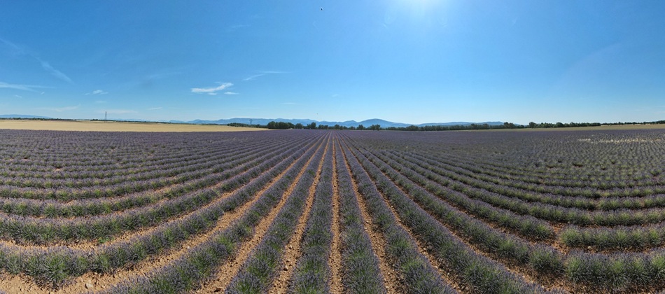 Es ist nicht allzu weit vom Nachtplatz nach Valensole. Und tatsächlich umgibt dieses ausgewiesene Zentrum des Lavendelanbaus gewaltige Felder. Mitte Juli sind die allerdings zum größten Teil bereits abgeerntet. An diesem heissen Tag lohnt es sich also nicht, eine Wanderung in der erbärmlichen Hitze über die schattenlosen Felder zu machen. Aber für ein paar Dutzend Fotos der noch nicht geernteten Felder und der Erntemaschine für Lavendelblüten reicht es.