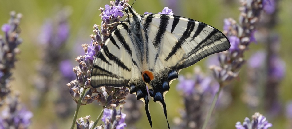 Der Weg führt zunächst durch ein schönes Bachtal und an einem ehemaligen Steinbruch vorbei. Leider ist es auch an diesem Tag sehr warm und der anschließende Aufstieg an die obere Kante des Steinbruchs (ca. 150 Hm) ist sehr mühsam. Zudem ist der Weg stellenweise recht zugewachsen, auch wenn er gut zu finden ist. Oben geht es entlang eines Lavendelfelds bis zu einer Wegabzweigung, ab der ein Weg wieder hinab führt.