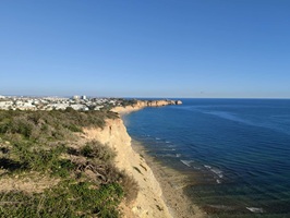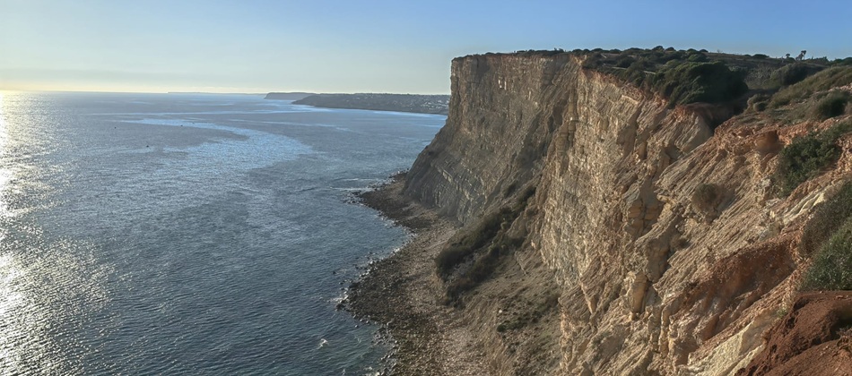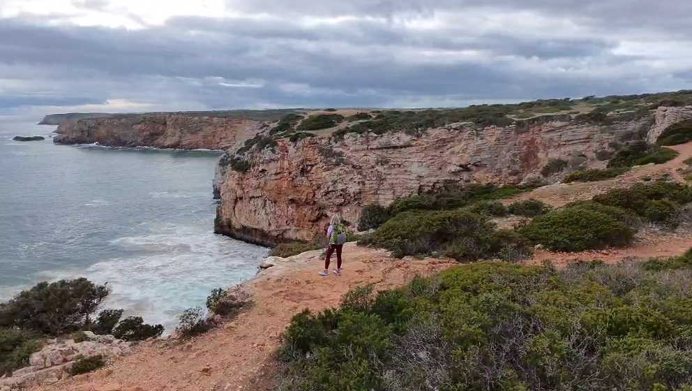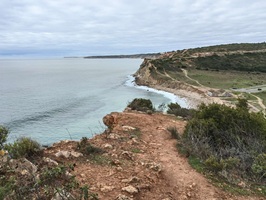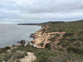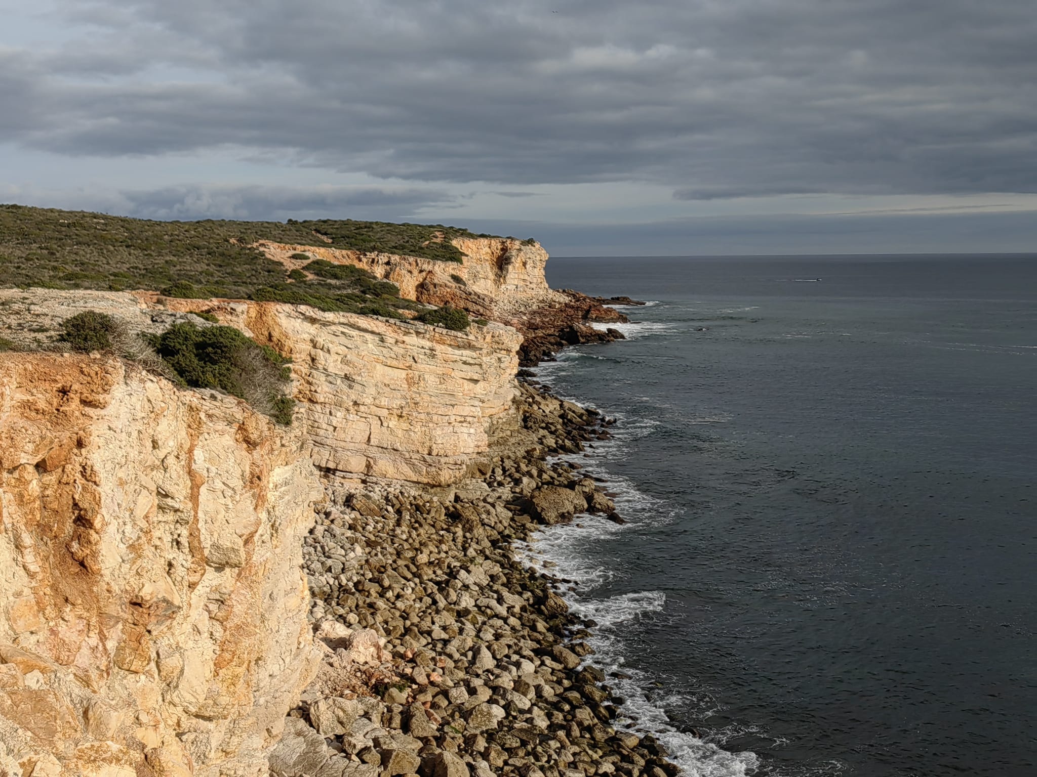Um 15 Uhr konnte ich dann endlich auf den Fischerpfad Richtung Südspitze Portugals starten. Dumm nur, dass das Tageslicht um 17:30 Uhr abgeschaltet wurde. Circa 16 Kilometer lagen vor mir; das sollte eng werden und ja, das wurde es auch. Es war ein Auf und Ab die abwechslungsreiche Steilküste entlang. Steile Klippen lösten lieblichen Sandstrand ab. Es war herrlich und dazu strahlte die Sonne vom stahlblauen Himmel.