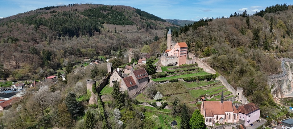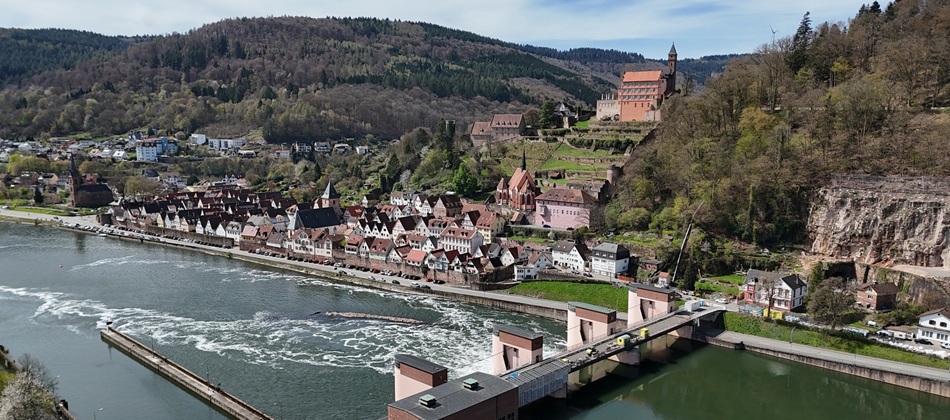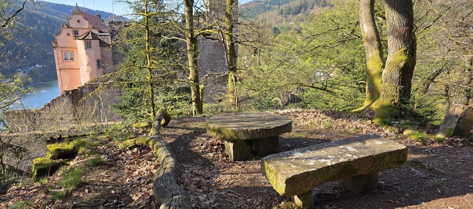 Wer bis zum nördlichen Ortseingang von Hirschhorn fährt, findet die schmale Zufahrtsstrasse hinauf zum Schloß von Hirschhorn. Unmittelbar an den hoch aufragenden Burgwänden ist ein kostenloser Parkplatz. Und hier startet auch der Rundwanderweg. Am Wanderwege-Schild vorbei geht es sogleich steil bergauf. Der felsdurchsetzte Bergkamm leitet zunächst zu einem alten Rastplatz mit Steintisch, von dem aus man einen recht guten Blick auf einen der Türme der Burganlage (1260 als klassische Höhenburg über dem Neckar errichtet) und hinab zum Neckar hat.