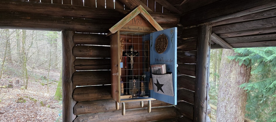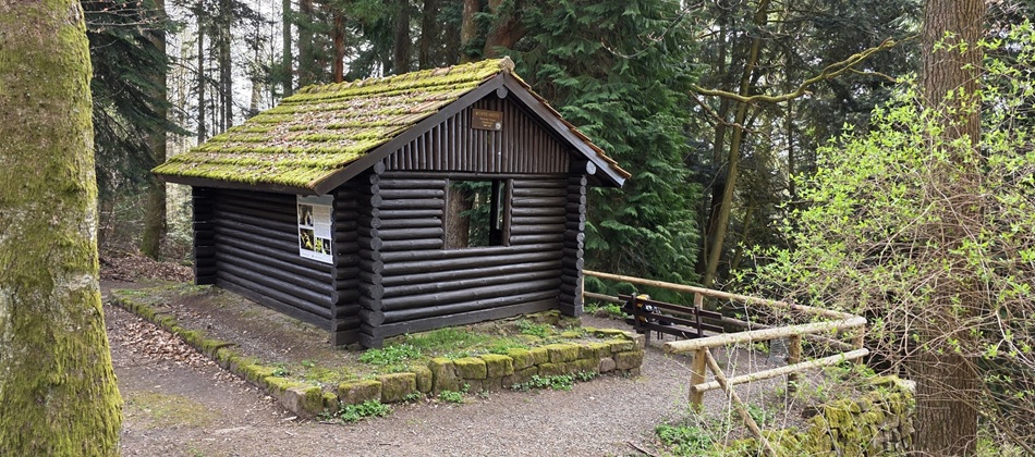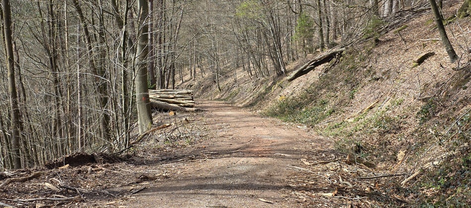 Die nächsten knapp 200 Höhenmeter folgt der Wanderpfad dem Bergkamm hinauf. Gelegentliche Ausblickstellen wechseln sich mit schönen Waldstücken ab, bis man auf die waagrecht verlaufende Forststrasse zur Hoppe Hütte trifft. Weit oberhalb des Neckars geht es nun in weitem Bogen durch den Hochwald zu der Hütte. Damit die überhaupt etwas Sicht hat, ist eine lange Schneise in den Wald geschnitten worden. Ein schattiger Platz für eine Rast im Hochsommer.