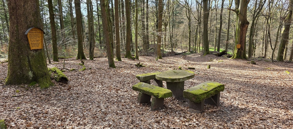 Nur 400 Meter weiter kommt man zum Kulturdenkmal Steinerner Tisch, zwei Sitzgruppen etwas abseits der Forststrasse mit Steintischen und Steinsitzplatz. Allenthalben warnen Schilder vor den „Waldtypischen Gefahren“, weswegen auch der zugehörige Rastplatz zu den Steinernen Tischen einige Meter abseits an einer Gabelung der Forststrasse angelegt ist.